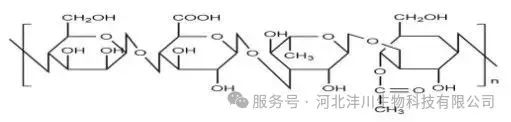 三贊膠為蛋白聚糖結構,由糖類、脂類、多肽三部分組成[2],基中單糖含有與結冷膠類似的糖骨架,由 4 種單糖組成,其主鏈結構為-1-3- -D-葡萄糖,4- -D-甘露糖-1-3- -L-鼠李糖,-1-4- -D-葡萄糖醛酸[3],在多糖組分上鏈接有蛋白側鏈;分子中含有1.49%的氨基酸,其中酸性氨基酸占23.3%[1]。