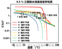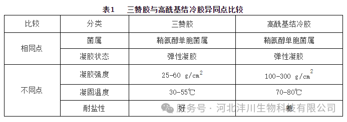 三贊膠具有鞘氨醇膠的糖主鏈,擁有和高;Y冷膠相近的凝膠特性。三贊膠升溫至 75℃以上,在不添加任何離子的條件下,冷卻至室溫可形成熱可逆的彈性性凝膠;雖然三贊膠和高酰結冷膠均可形成彈性凝膠,但凝膠強度和凝固溫度等還存在較大差異,詳見表1。