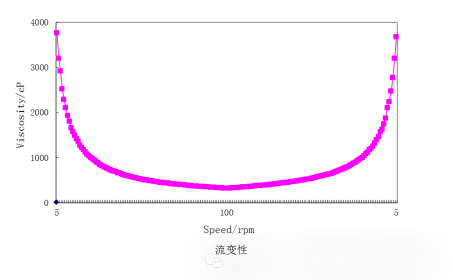高剪切作用下黏度下降,剪切作用消失黏度恢復正常。 三贊膠溶液粘度隨轉速增加而降低,60r/min后下降趨勢平緩,說明該溶液具有剪切稀釋性質;轉速降低過程中,粘度逐漸增大,最后恢復到測試開始時的狀態,表明該溶液具有良好的假塑性。曲線于X軸100r/min的垂線作為分界線,左右兩邊對稱,表明該溶液粘度恢復時無滯后性。