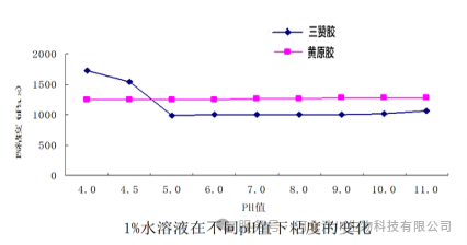 在酸堿條件下穩定,在弱酸條件下粘度略升高: 三贊膠由于特殊的結構,具有在弱酸條件下粘度升高的特性,使其粘度遠遠高于黃原膠,賦予三贊膠在酸性飲料中良好的懸浮性能。