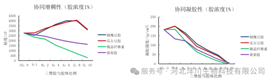 與其它膠體具有良好的兼容和配伍性。 復合膠與單體膠比較具有十分突出的優點。通過膠體的混合搭配,不但能發揮各種單體膠本身的作用,使性能互補,還可以達到各種膠體間協同增效作用,從而擴大膠體的應用范圍并提高其功能,同時降低了膠體的用量,從而降低了生產成本。三贊膠與瓜爾豆膠、刺槐豆膠、微晶纖維素配比為9+1時強度最高,具有協效性,與其它膠體具有良好的兼容性。