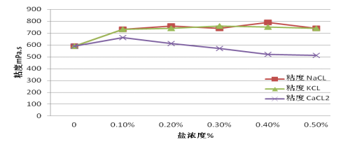 三贊膠對鹽離子比較敏感,加入0.1%的鹽離子即可使其粘度大大提升,三贊膠對一價離子反應較平穩,粘度隨一價離子的增加粘度基本持平;對鈣離子反應敏感,當在CaCL2濃度超過0.1%時,隨氯化鈣濃度增大粘度呈下降趨勢。并且添加鹽離子可明顯提高三贊膠在耐溫性,在121℃滅菌15min或UHT138℃滅菌30s,仍有較高的粘度。