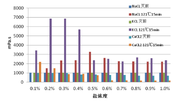圖9 0.25%三贊膠在不同濃度不同鹽溶液中121℃滅菌15min粘度變化