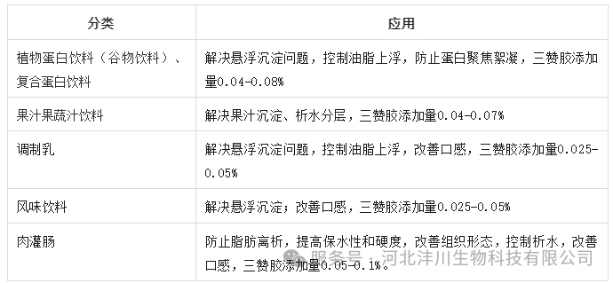 作為一種新食品添加劑,三贊膠的持續擴大,自2020年6月,衛健委四號文正式批準三贊膠作以增稠劑、穩定劑、凝固劑使用于食品行業中,目前已被批準用于調制乳(食品類別01.01.03)、肉灌腸(食品類別08.03.05)果蔬汁(漿)飲料(食品類別14.02.03)、植物蛋白飲料(食品類別14.03.02)、復合蛋白飲料(食品類別14.03.03)、風味飲料(食品類別14.08)等領域。